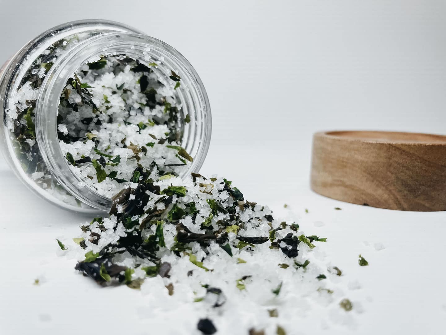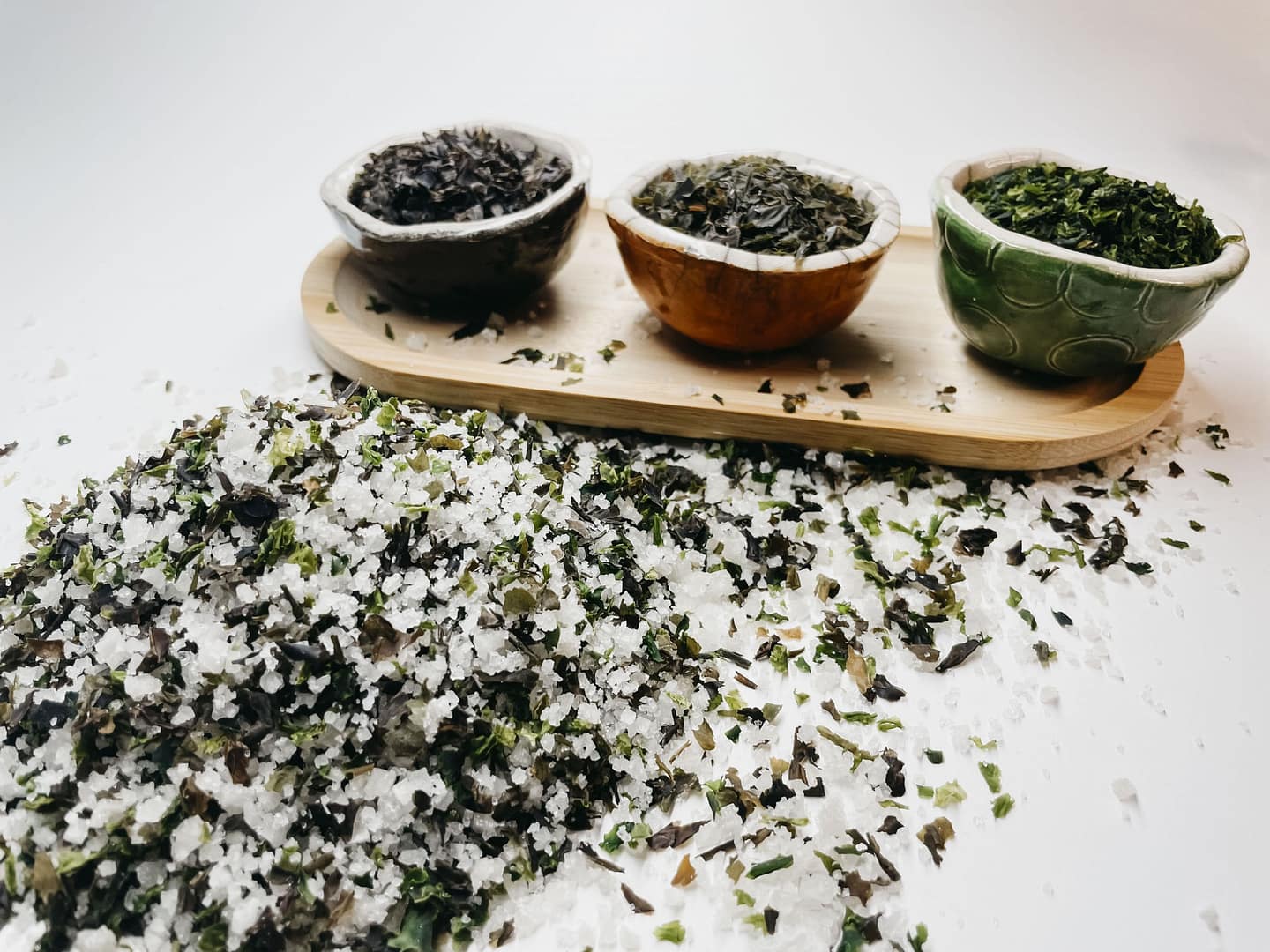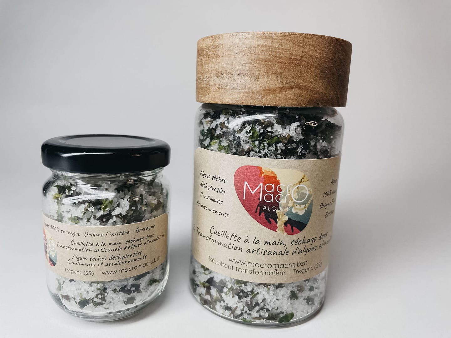 Ce mélange associe la Fleur de sel de Noirmoutier récoltée à la main par un saunier indépendant, à trois algues bretonnes que nous cueillons à la main dans le Finistère : Kombu royal, laitue de mer et nori. Chacune apporte sa personnalité et ses bienfaits pour un assaisonnement aussi bon que naturel.